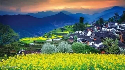 成大片金黄色油菜花的世界,白墙黛瓦掩在黄花绿树间,溪泽映着旷野和古树,阵阵云雾飘来,恍若天上人间,是心放松的世外桃源,让游人无比陶醉。
