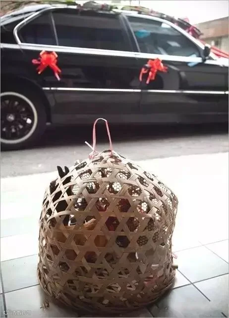 结婚当日,随新娘礼车,用“槎箩”挑到男方家里,“带路鸡”一定要大要壮,尤其是母鸡,最好一带进新娘房中,放在床下当日就会下蛋最佳。