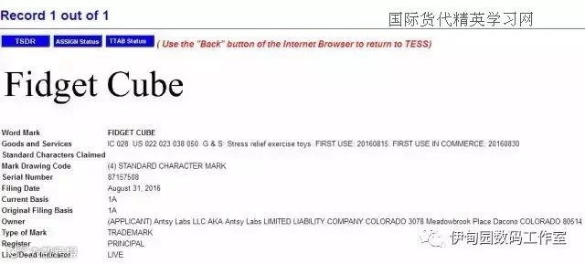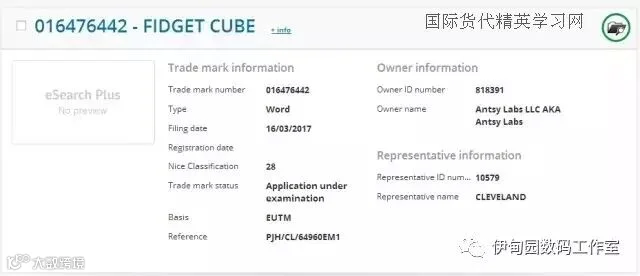 最后,减压魔方(Fidget Cube),小编查到中国关于fidget cube 商标注册情况时,瞬间惊呆!从去年11月份到今年1月份,一共有4位申请人提交了fidget cube 申请28类,欧盟和美国也有申请,同一申请人ANTSY Labs. LLC,由此,小编推断,这款魔方的发明者很有可能就是这家美国公司,也有可能申请了美国的外观和发明!也是在去年下半年,是一名英国人向英国商标局提交了fidget cube 28类的商标申请。截至目前,fidget cube就是在日本没有检索到相同的商标申请,但是,日本的商标检索盲期也有2-3个月,因此,也很难说在3月份到现在是否有人提交了fidget cube 的商标申请!
