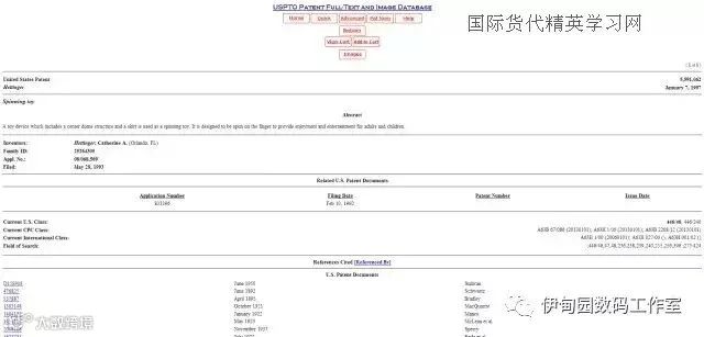 在前面的文章中,咱们方信知识产权的小编,就指尖陀螺的商标专利问题做过一次查证!指尖陀螺在美国不符合外观申请的条件,而其英文FIDGET SPINNERY有登记申请的记录。近日,指尖陀螺这款玩具的发明人开始为人所知。据证实,指尖陀螺的雏形是迷你旋转器,是一位美国患重症肌无力的妈妈 Catherine A. Hettinger 为自己女儿而发明的玩具,她在1993年5月28日向美国官方提交了“spinner toy”的发明专利申请,于1997年1月7号获准注册。而当时这款玩具并没有热卖,Catherine A. Hettinger也没能因为这款发明获得收益,最后因为无法担负专利的续展费,在2005年1月7号,这项发明专利失效了。