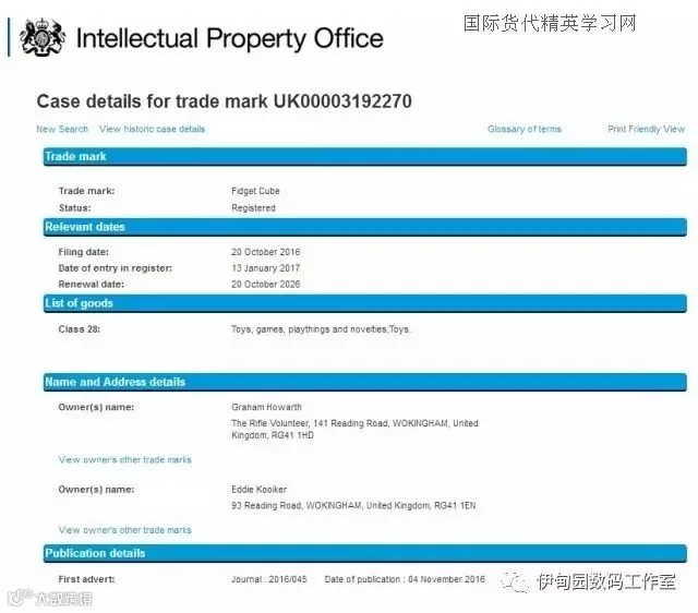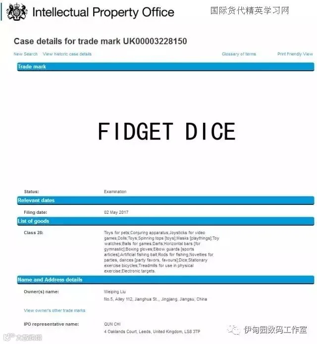 方信小编顺手研究了一下相关还有没有类似的商标, 结果还发现了一个减压骰子(fidget dice),就在前几天,来自江苏省的朋友向英国商标局申请了fidget dice 28类商标。