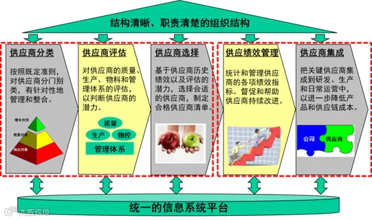 五步流程的成功实施取决于结构清楚、职责清晰的供应商管理组织。供应商管理是跨职能、跨阶层行为,职能与职能、总部与分部之间分工不清,就没法形成合力,以制定统一的供应商战略、选择和管理供应商,以及与强势供应商抗衡。而统一的信息平台则为供应商有关的决策和绩效管理提供充分的信息,同时帮助固化供应商管理的流程。