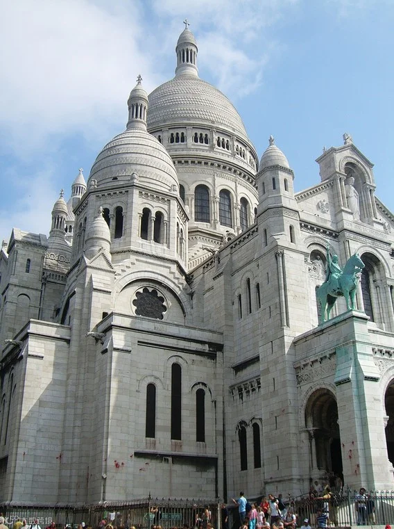 圣心教堂位于巴黎的蒙马特高地(Butte de Montmartre)。教堂建筑风格独特,既似罗马式,又似拜占庭式。钟楼内部呈方形,有一口大钟,叫萨瓦人钟,重19吨,是世界著名大钟之一。教堂有三扇拱形门。门顶两侧有两座骑马的雕像,一座是国王圣路易。另一座是法国的民族女英雄贞德。它始建于1876年,于1919年落成,是由全法国的忠实信徒捐款兴建的。教堂里面有许多浮雕、壁画和马赛克镶嵌画。这里颇具吸引力的地方是蒙马特广场,它是巴黎最有艺术特色的地方。不知从何时开始,这里成了露天大画室,很多年轻画家在此写生。
