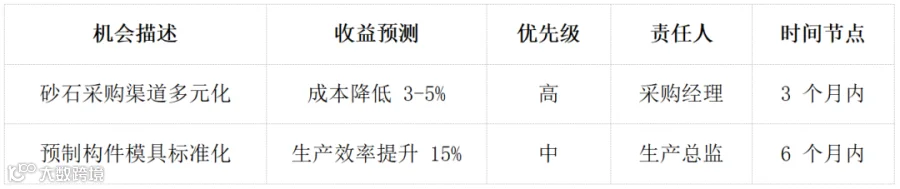 对识别的机会按 “收益潜力 × 可行性” 排序,制定行动路线图。例如: