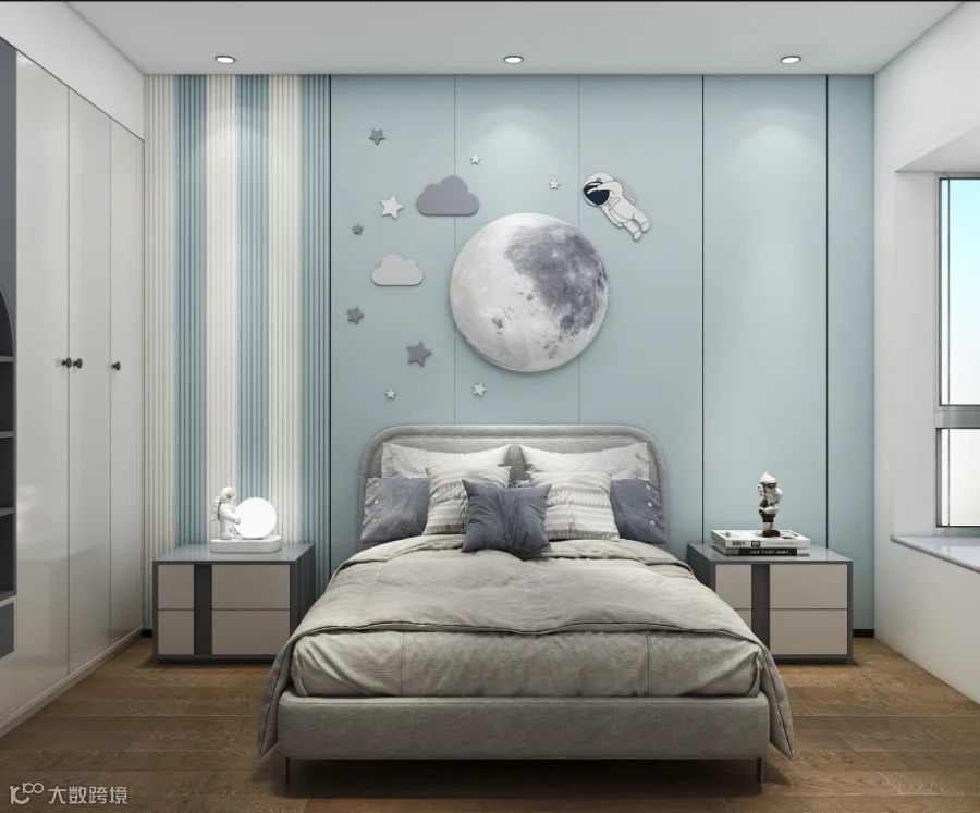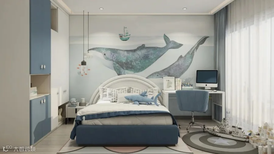拱形的床仿佛穿越海洋,淡雅的水蓝色墙板缓缓要延伸出海洋生物,营造了一个安逸舒适的海洋氛围。