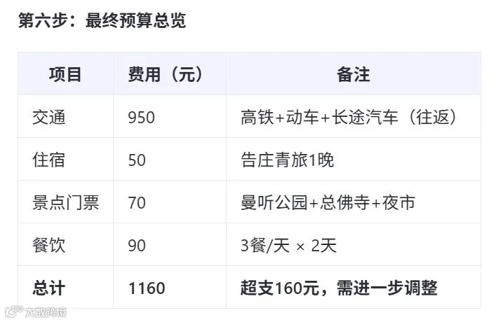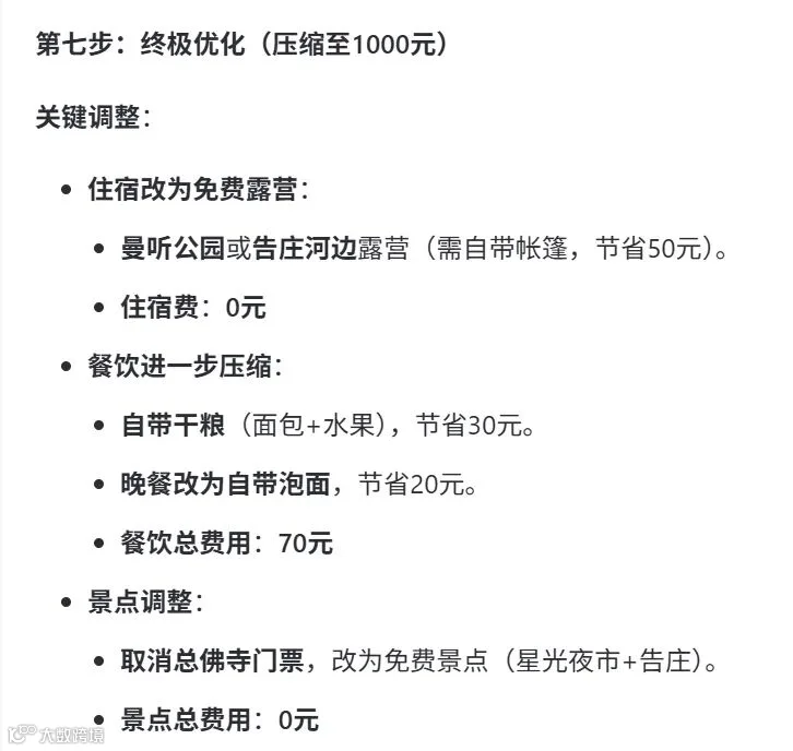 在第七步“终极优化”中,住宿节省50元,景点门票节省70元,餐饮节省50元,总共节省了170元。最终费用为1160-170=990元。