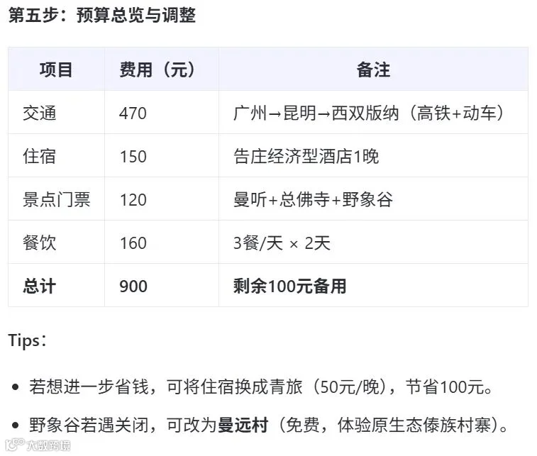 1000元以内从广州到云南西双版纳2天1夜游,还要包吃住,这实在是很难。眼尖的小伙伴估计已经发现,上表总预算缺失了返程的交通费用,这份攻略仍有待优化。