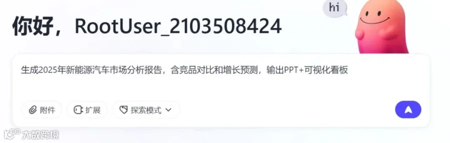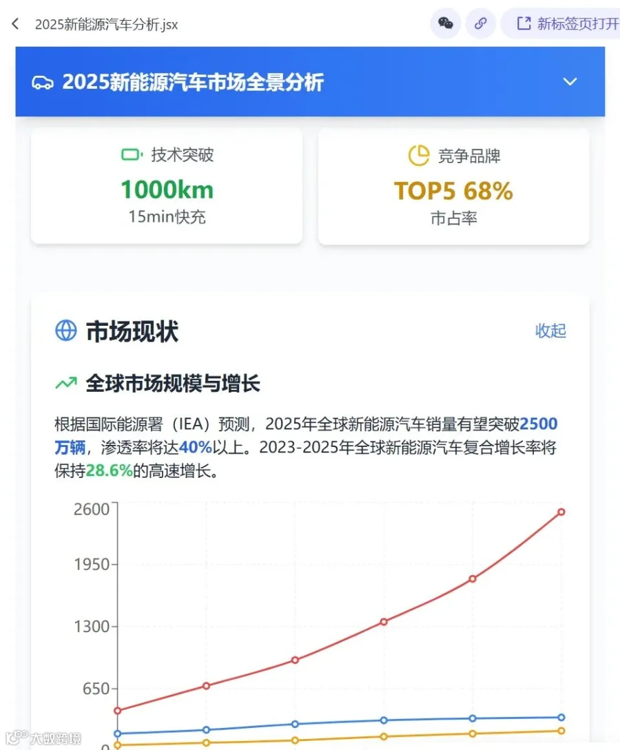 场景痛点:市场部小王需要连夜完成《新能源汽车市场分析报告》,传统方式需8小时收集数据、制作图表、撰写文案。