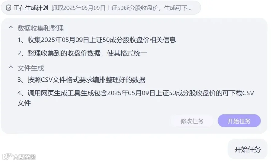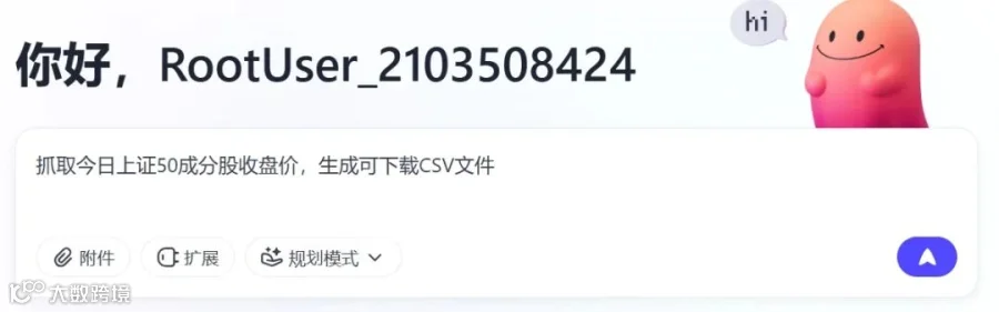 1.输入指令:"抓取今日上证50成分股收盘价,生成可下载CSV文件"