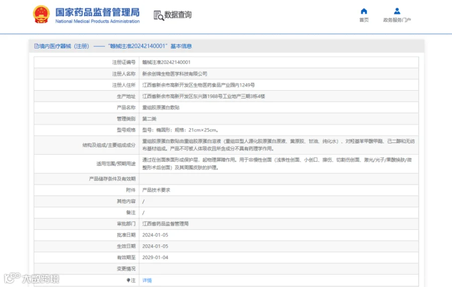 2024年1月5日,创尔生物旗下子公司新余创锦生物医学科技有限公司自主研发的“重组胶原蛋白敷贴”成功获得医疗器械注册证(注册证编号:赣械注准20242140001)。该产品的获批,有效补充了公司的产品结构,标志着广州创尔生物技术股份有限公司在重组技术应用上的储备取得了重大进展。作为胶原蛋白行业的领军企业,创尔生物未来将持续围绕医用活性胶原产品,通过各类关键性技术突破,完善产品结构、夯实供应链价值。