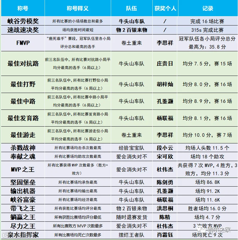 2022年12月5日,创尔生物主办方在广州本部举行了隆重的颁奖仪式。获得冠亚季军的队伍依次为卷土重来、牛头山车队和懂王者的队,获得“荣耀四强”队伍是哥哥别打我,获得“荣耀八强”称号的队伍(排名不分先后)分别为:辣椒炒西红柿、爱会消失对不、随时退赛发货和全队都坑。除了以上名次奖项外,本次主办方还设立了特殊奖项,以兹鼓励在本次赛事中表现优异的团队和个人(见下表所示)!