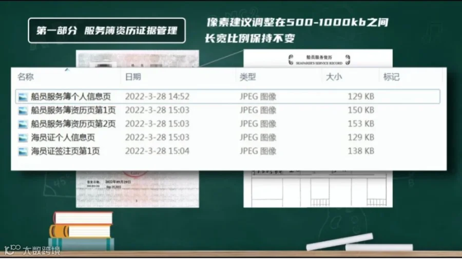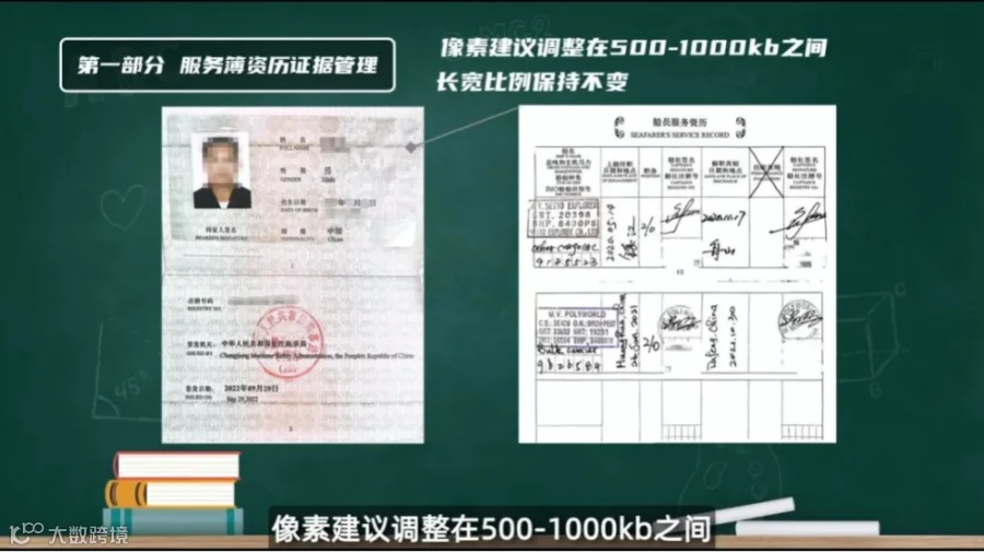 [首先拍照存档。对服务簿的个人信息页需要的服务资历页进行拍照,如需无限航区的资历,还应将对应的海员证或护照信息页、签注页进行拍照。拍照时应将整个页面置于画面中,像素建议调整在 500 ~ 1,000 kb 之间,长宽比例保持不变,命名为“船员服务簿个人信息页”、“服务簿资历第一页”等等。然后上传照片。]