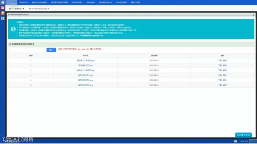 [进入船员服务簿资历相关证据上传。找到您需要的照片,按顺序上传,传输成功后,页面会显示文件名,可点击相应的图标进行查看。]