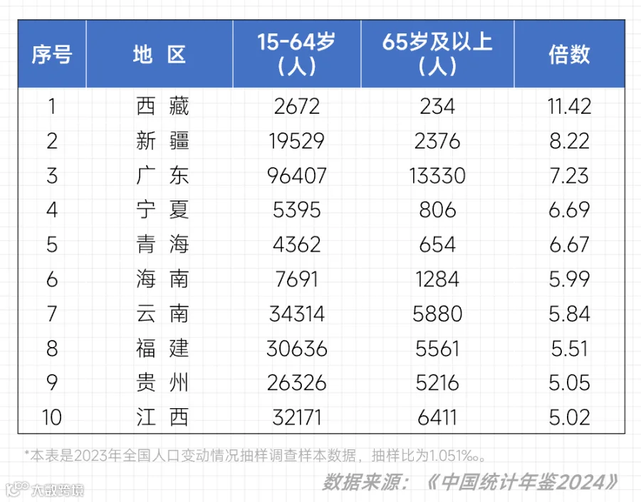 更别提老年人口占比少的西藏、新疆、广东,分别是7倍、8倍、11倍以上。
