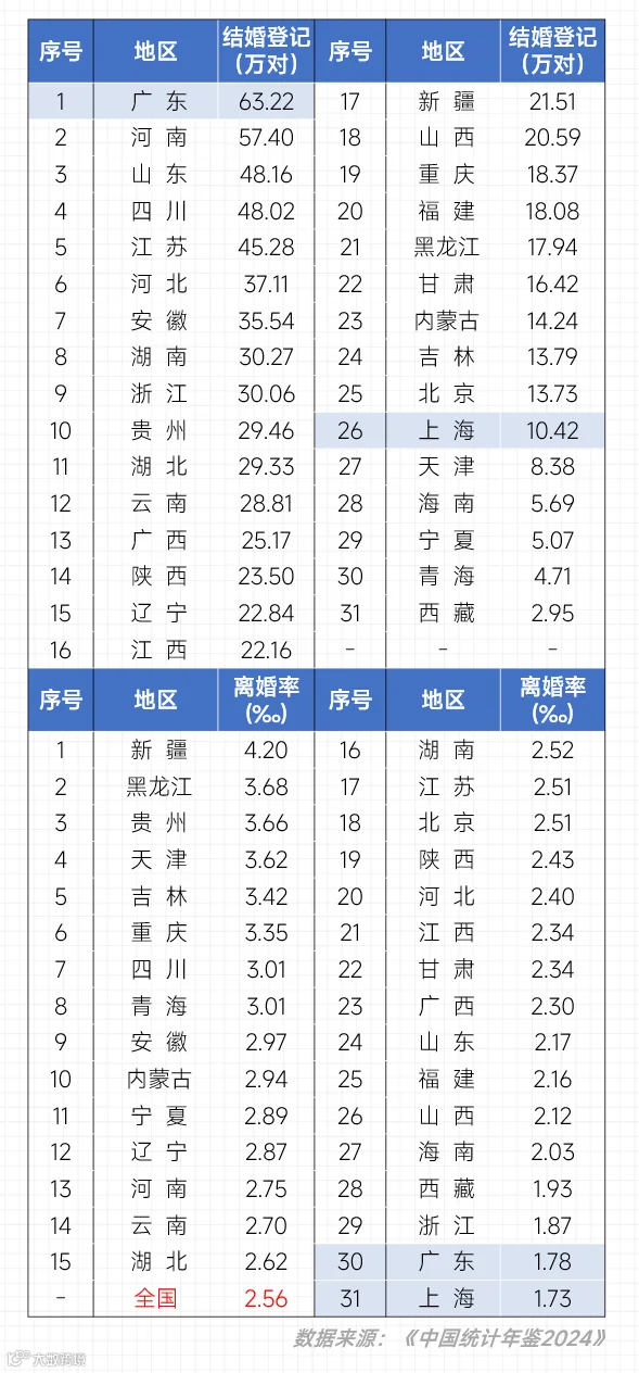 虽然上海的结婚情况不算好,但是离婚率和广东分别列数全国倒数第一、第二。颇有点“严进严出”、“沉没成本高”的架势。