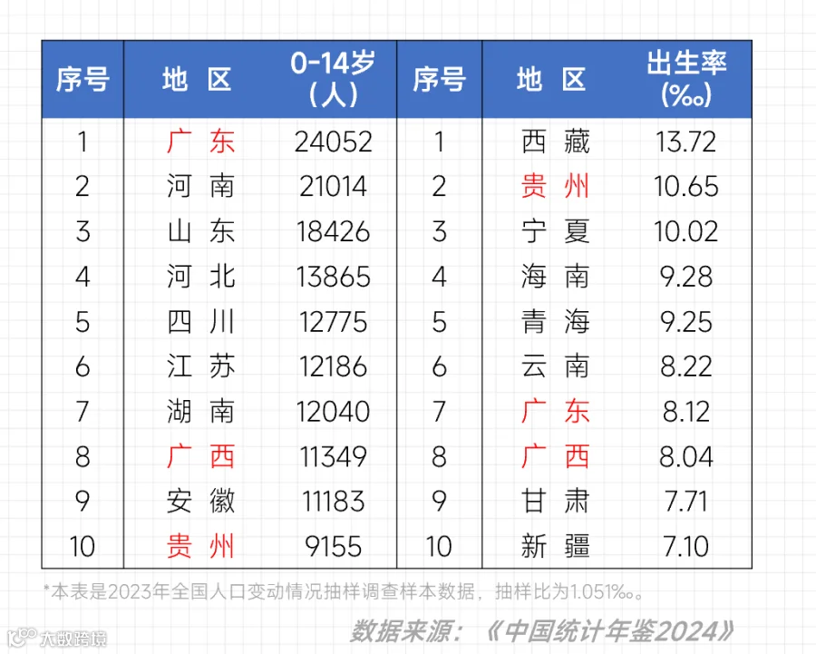 那么,你还可以从0-14岁的人口排名中找,找那些出生率也同样靠前的地区,比如广东、广西、贵州。