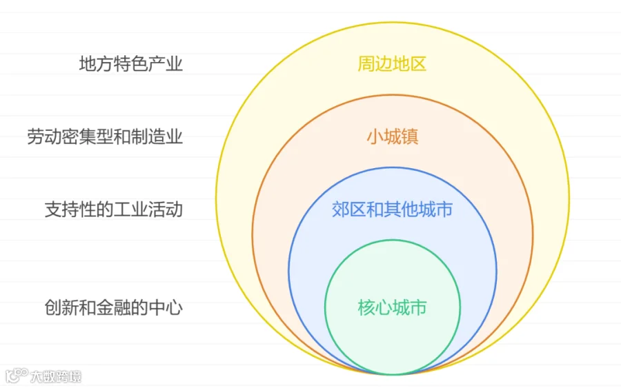 往外,是郊区和其他城市,则承接了从中间转移的公司总部、支持核心城市的产业。