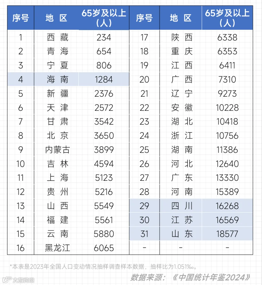 但是海南65岁及以上的老人,和山东、江苏、四川比起来,实在太少了。