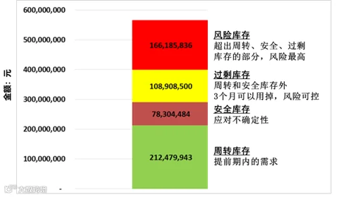 对于很多料号,这个企业把安全库存和需求预测放在一起,并不在ERP中设相应的安全库存,只是多下些订单。这是不规范的做法,前面已经说过了。我们就让他们逐行确认,把安全库存的部分甄别出来,总额7830多万元。对于超出周转和安全库存的部分,该企业认为,如果不超过3个月的正常需求,风险就相对可控,那就是过剩库存。其余的就是风险库存,即超出了周转和安全库存,3个月还消耗不掉的库存。在这个案例中,风险库存总额为1.66亿元,占所有库存的近30%,是个大问题,如图 1。