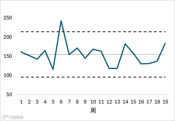 顾名思义,极端值明显与众不同,也叫异常值、离群值。它们要么太大,要么太小,落到正常的区间之外。如图1,该产品的需求没有季节性,也没有趋势,如果我们用平均需求加减两倍的标准差作为上下限,那么第6周的需求超出上限,就是极端值。