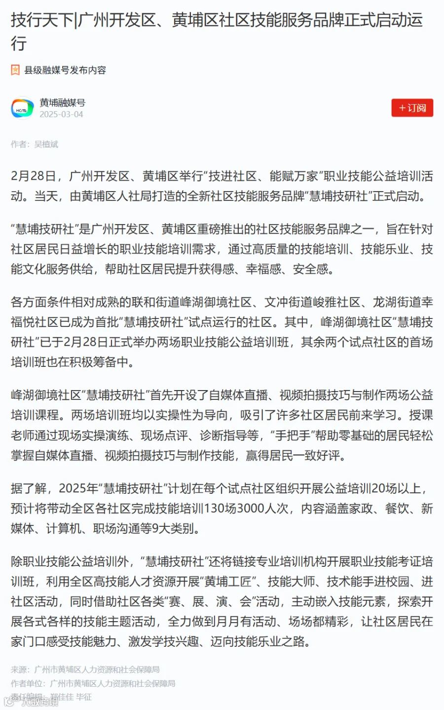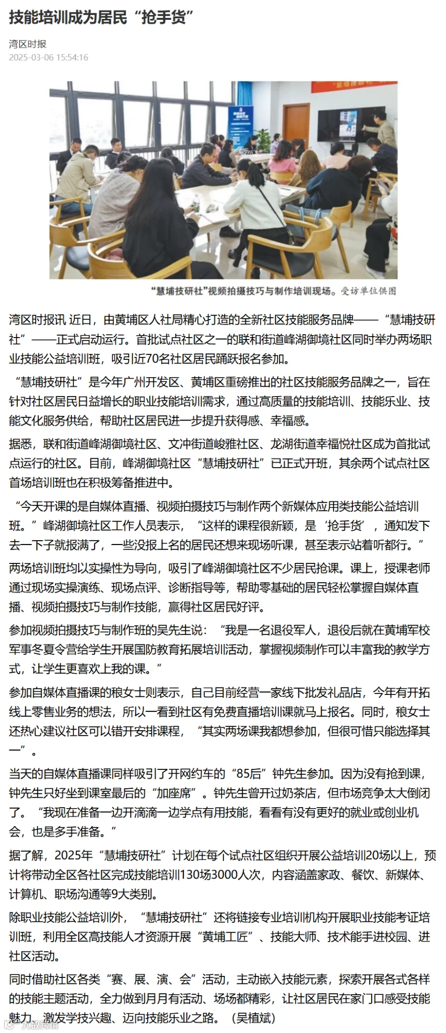 “慧埔技研社”是广州开发区、黄埔区重磅推出的社区技能服务品牌之一,旨在针对社区居民日益增长的职业技能培训需求,通过高质量的技能培训、技能乐业、技能文化服务供给,帮助社区居民提升获得感、幸福感、安全感。