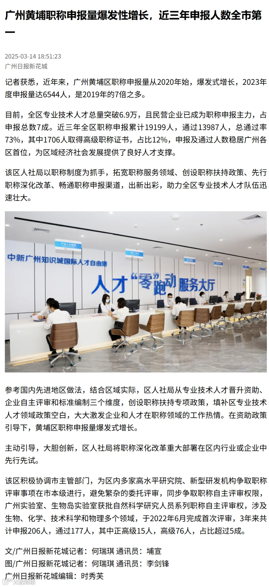 全区专业技术人才总量突破6.9万,且民营企业已成为职称申报主力,占申报总数7成。近三年全区职称申报累计19199人,通过13987人,总通过率73%,其中1706人取得高级职称证书,占比12%,申报及通过人数稳居广州各区首位,为区域经济社会发展提供了良好人才支撑。