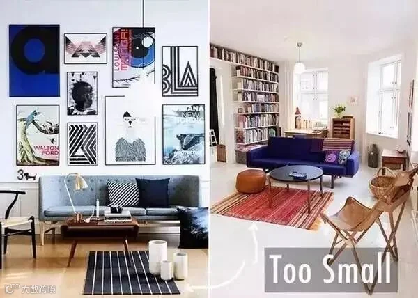 现如今早已过了将地面全部铺上地毯的年代,但很多喜欢家居设计的人都会用小块的地毯来装点自己的家居环境。但地毯过小也不好看,让房间看起来空荡荡的,尽管你四周已经装点的很完美了,但地面上的视觉空荡感会打破整体效果。