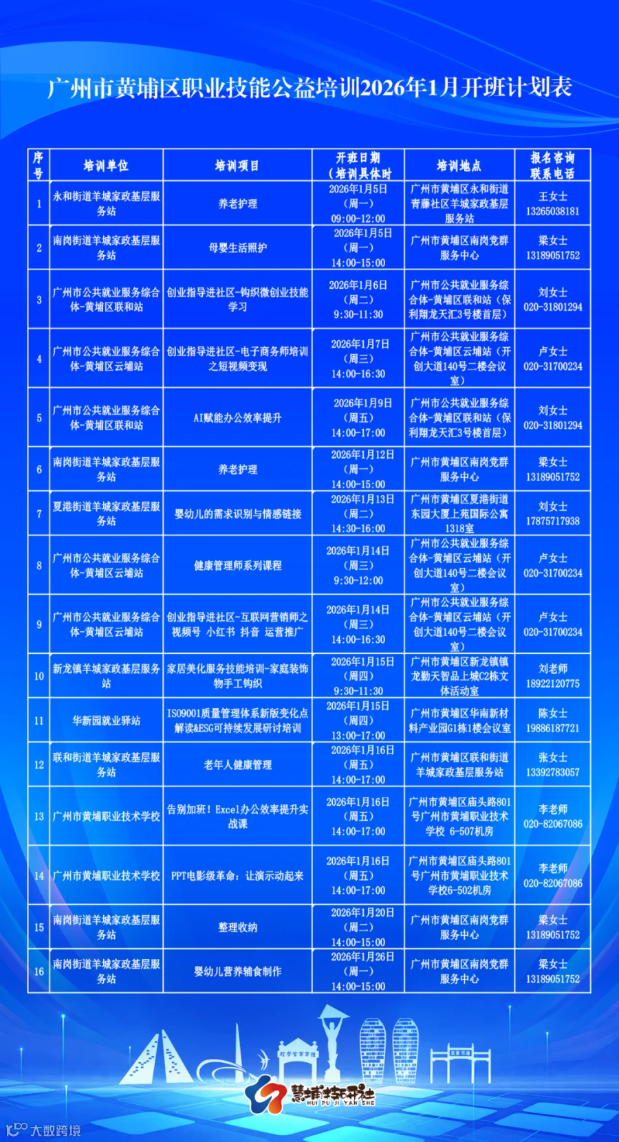▲上下滑动,查看黄埔区职业技能公益培训2026年1月开班计划表,培训安排最终以实际开展为准