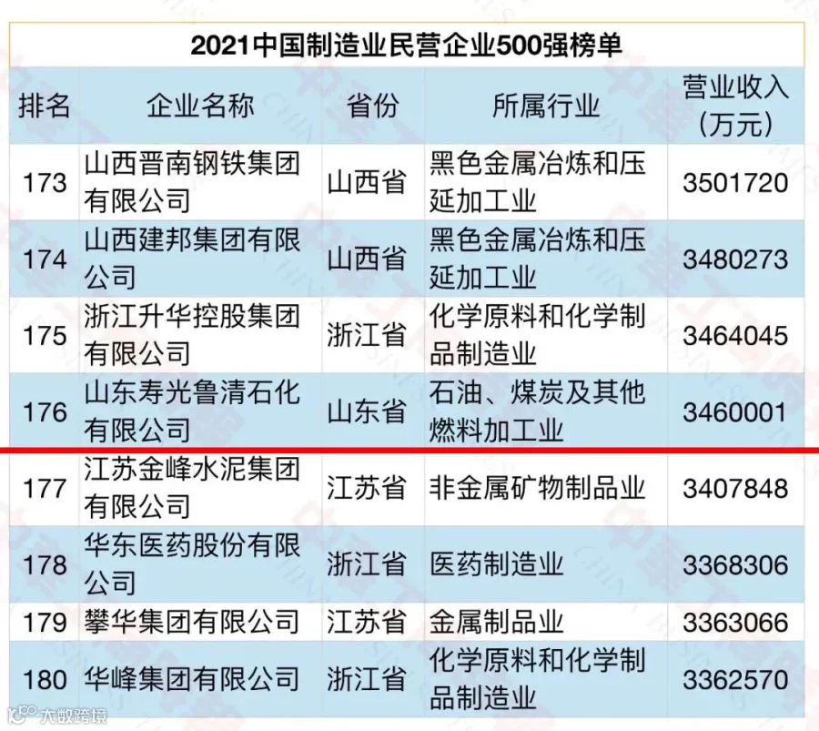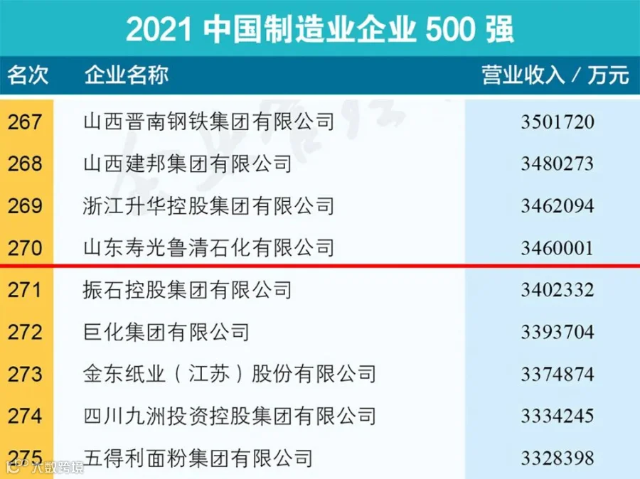 鲁清石化荣登2021年中国制造业企业500强