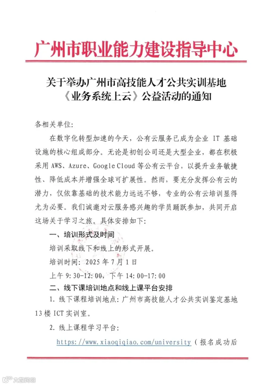 关于举办广州市高技能人才公共实训基地《业务系统上云》公益培训的通知