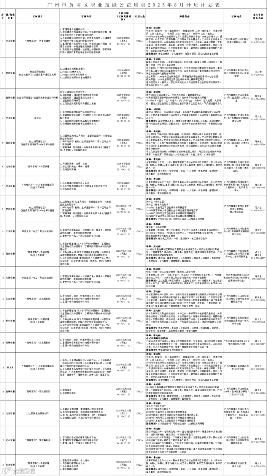 市黄埔区职业技能公益培训2025年8月开班计划表如下,