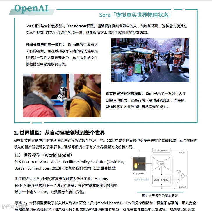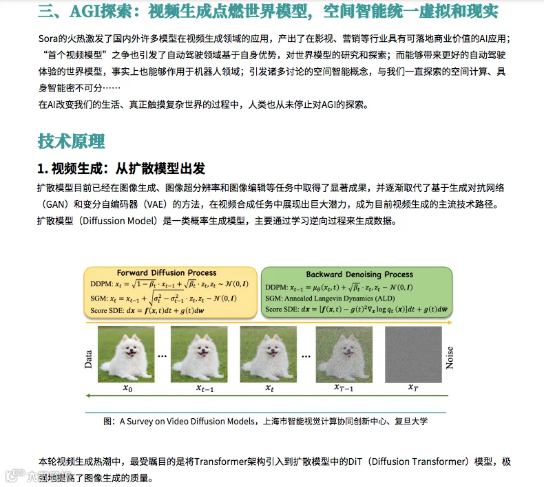 报告探讨了人工通用智能(AGI)的探索,特别是视频生成技术的发展,为 AI 的广泛应用打开了新的可能性。