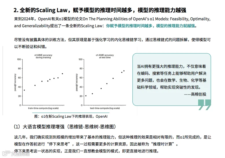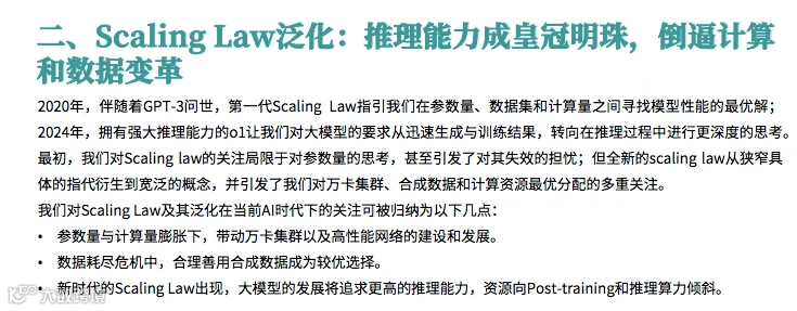 AI 模型的性能与规模的关系被重新定义。报告强调,推理能力成为 AI 发展的新焦点,推动计算和数据的变革。