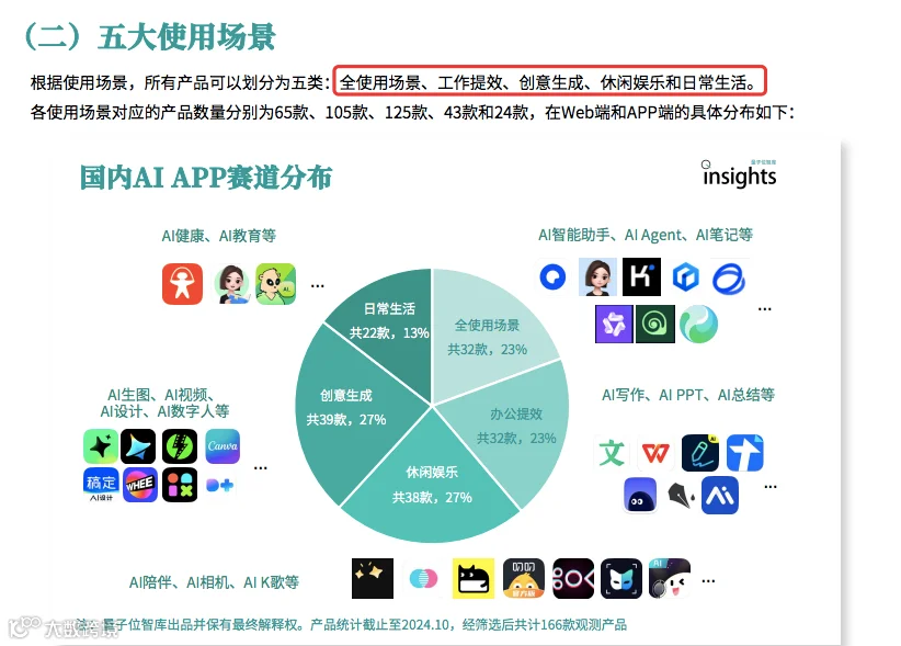 五大使用场景包括:全使用场景、工作提效、床医生成、休闲娱乐和日常生活。