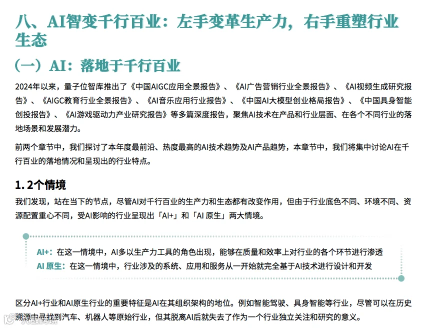 在人工智能(AI)技术日益成熟的今天,AI 的应用已成为推动行业发展的关键力量。量子位智库最新发布的《2024年度AI十大趋势报告》为我们揭示了 AI 领域的最新发展趋势和行业变革。