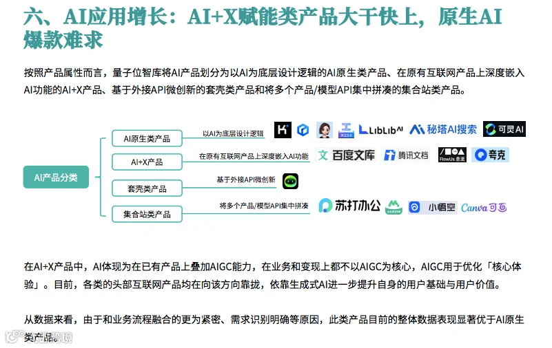 AI+X 赋能类产品快速增长,而原生 AI 爆款难求,反映了 AI 技术与行业深度融合的趋势。