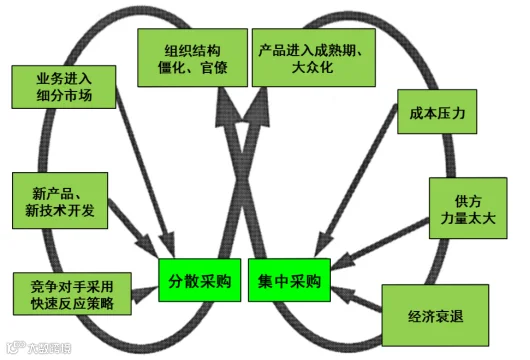 比如2008年的金融危机后,成本压力大增,大型国企、央企、民企纷纷走上集中采购之路,一个家电巨头也把事业部的采购权集中到总部。几年后,经济形势改变了,这个巨头的战略也跟着改变,从效率导向转变为创新导向,集中采购带来的响应速度慢问题就更加突出,于是就走上分散采购的路,把供应商的选择跟管理下放到事业部。
