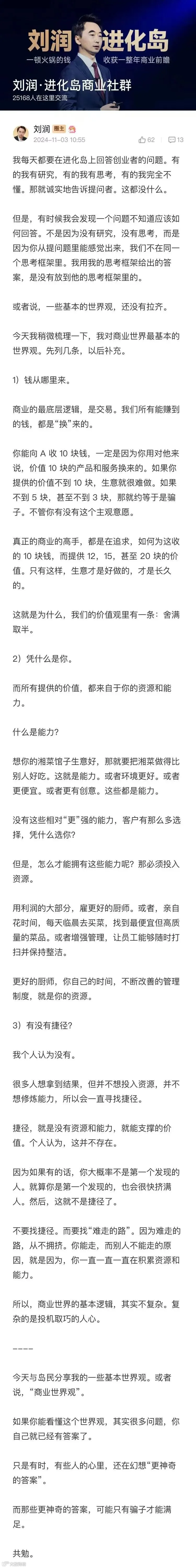 文章最后,我想送给你三句话,这是前段时间,我在商业社群“进化岛”里发的一条动态,说了我对商业世界最底层的3条世界观,引起了很多人共鸣: