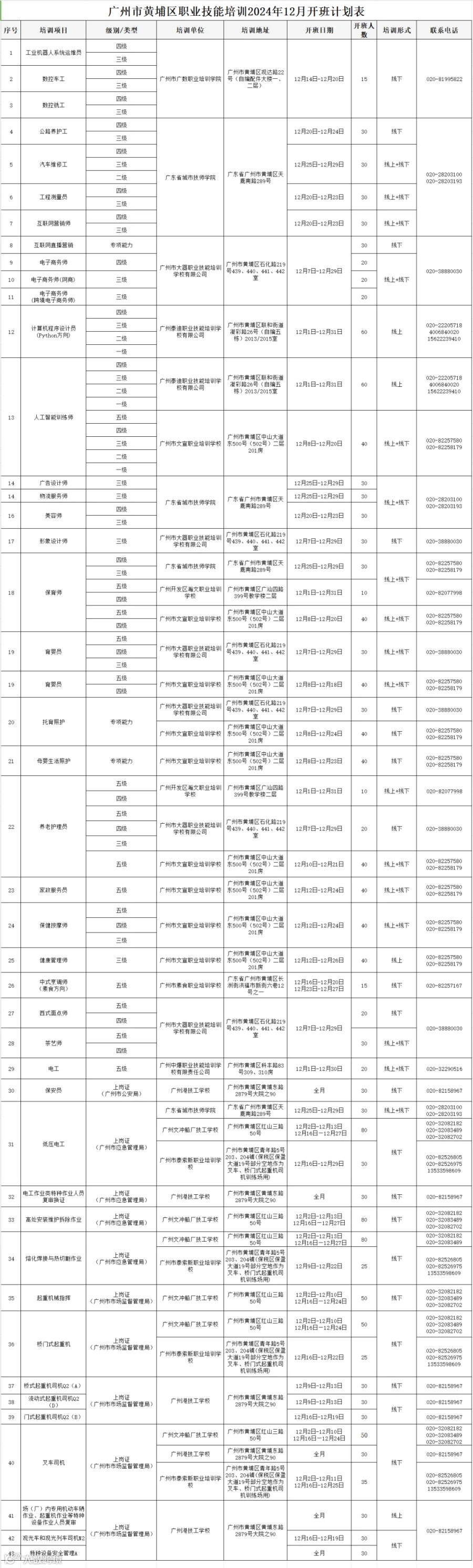 广州市黄埔区职业技能培训2024年12月开班计划表