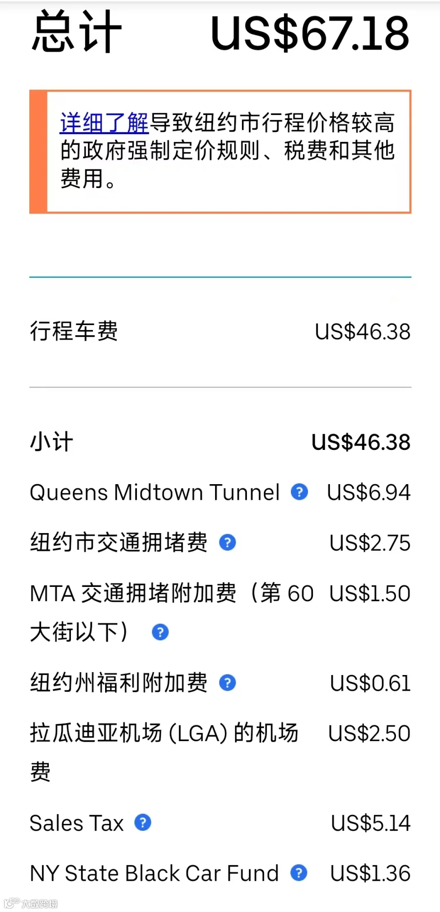 原本46美元的打车费,叠加到最后,硬生生要交67美元。