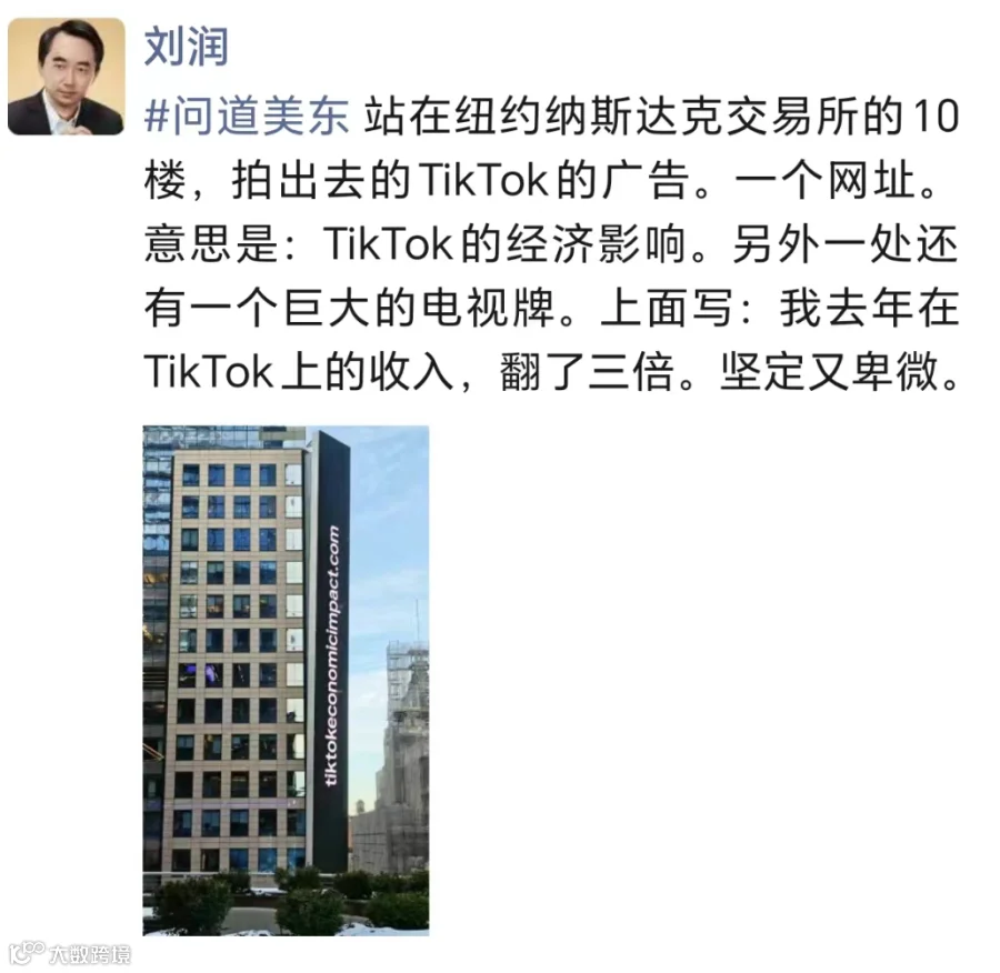 站在纳斯达克的10楼,向外看去,我看到了一个TikTok的广告。