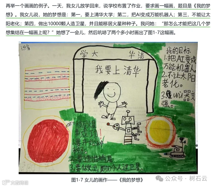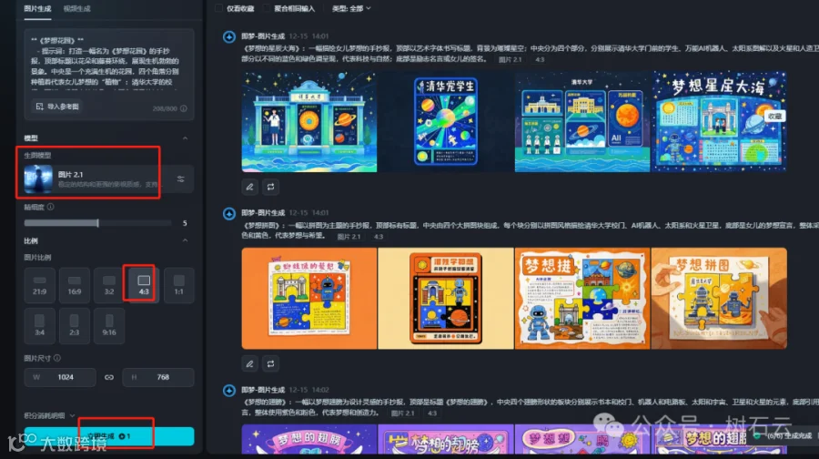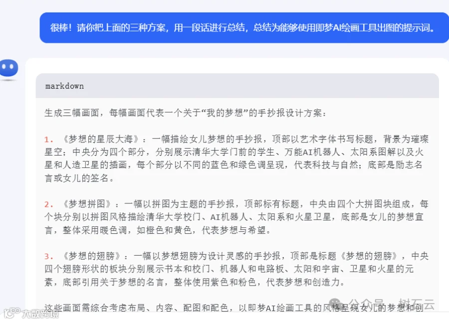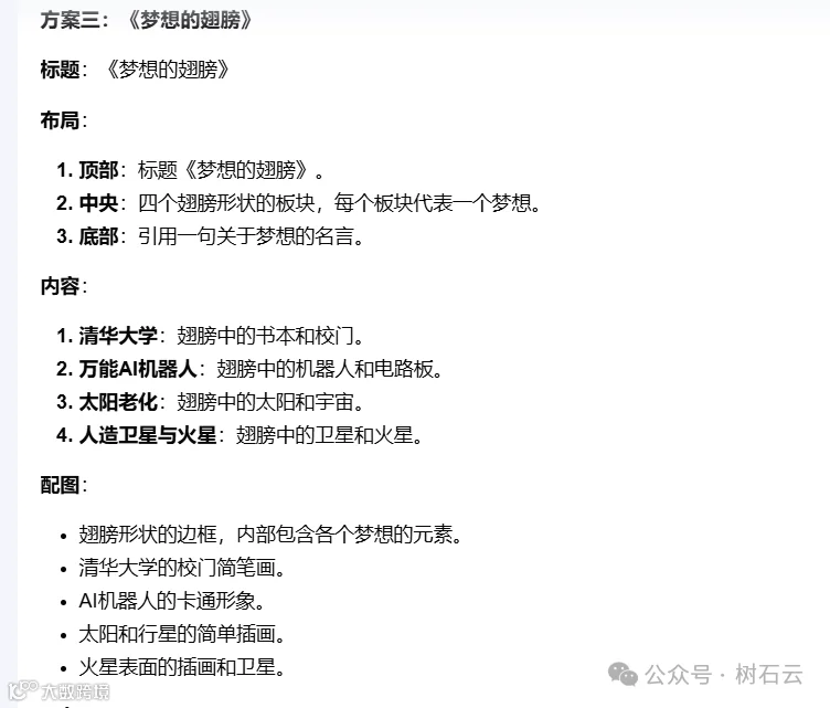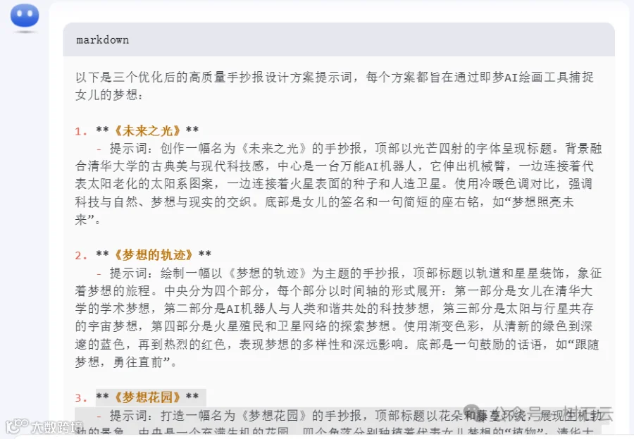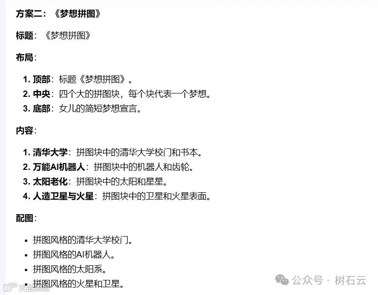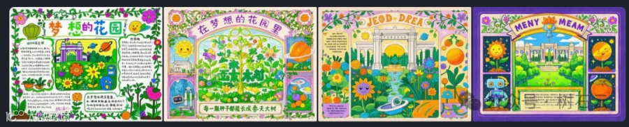 - 提示词:打造一幅名为《梦想花园》的手抄报,顶部标题以花朵和藤蔓环绕,展现生机勃勃的景象。中央是一个充满生机的花园,四个角落分别种植着代表女儿梦想的“植物”:清华大学的校门、万能AI机器人的花朵、太阳和行星的树木、火星与卫星的果实。使用丰富的自然色彩,如绿色、黄色、橙色和紫色,表现梦想的多彩和活力。底部是女儿的个人感悟或对未来的展望,如“在梦想的花园里,每一颗种子都能长成参天大树”。