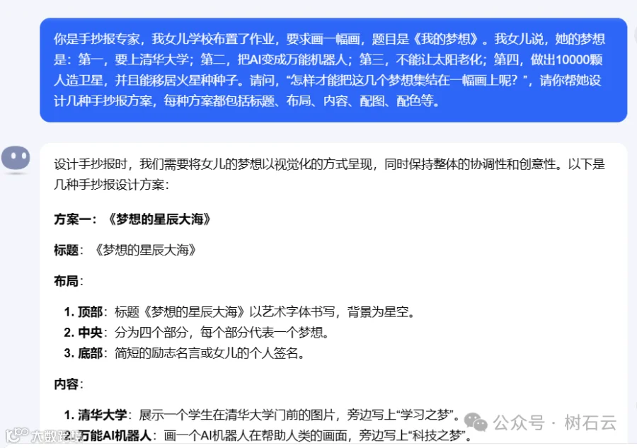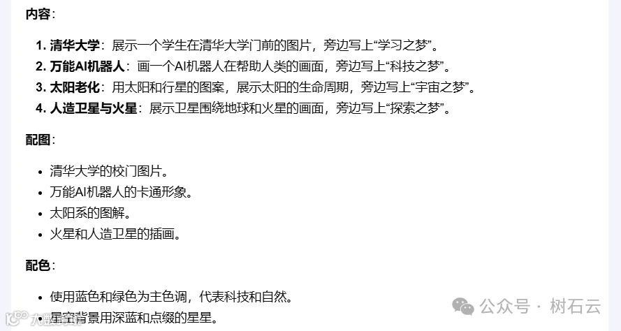 - 提示词:创作一幅名为《未来之光》的手抄报,顶部以光芒四射的字体呈现标题。背景融合清华大学的古典美与现代科技感,中心是一台万能AI机器人,它伸出机械臂,一边连接着代表太阳老化的太阳系图案,一边连接着火星表面的种子和人造卫星。使用冷暖色调对比,强调科技与自然、梦想与现实的交织。底部是女儿的签名和一句简短的座右铭,如“梦想照亮未来”。