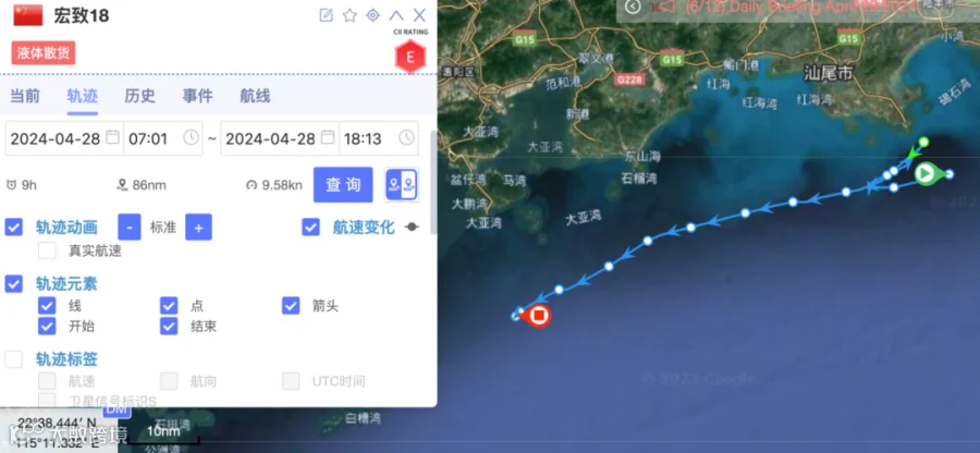 4月28日上午,由中化石油成品油销售承租的装载12000吨柴油船舶“宏致18”轮在广东汕尾海域成功救起两名落水渔民,上演了一场惊心动魄的生死营救。