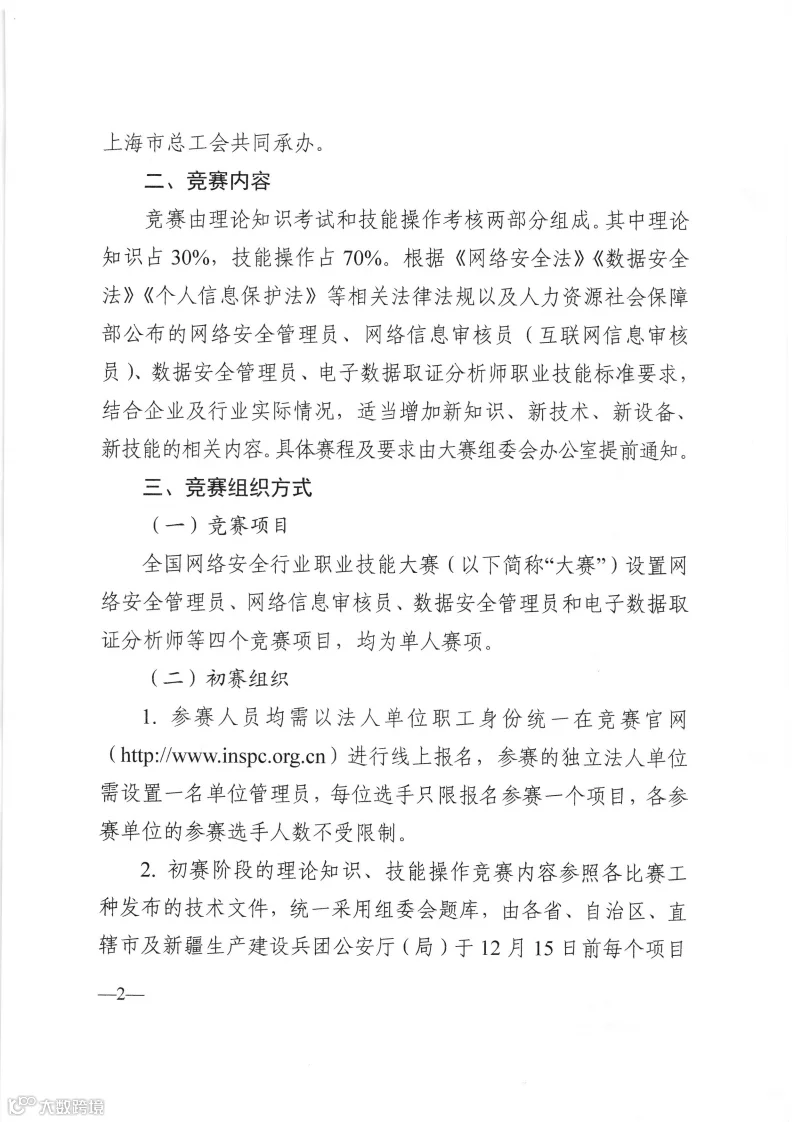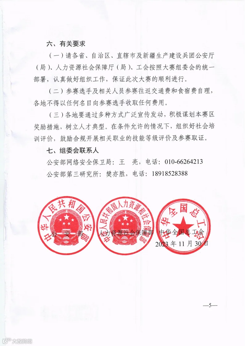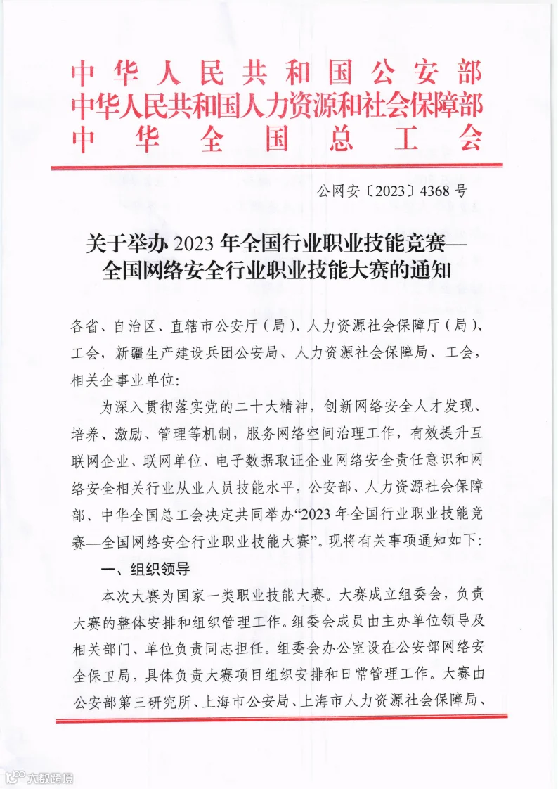 中华人民共和国公安部、中华人民共和国人力资源和社会保障部、中华全国总工会举办2023年全国行业职业技能竞赛———全国网络安全行业职业技能大赛