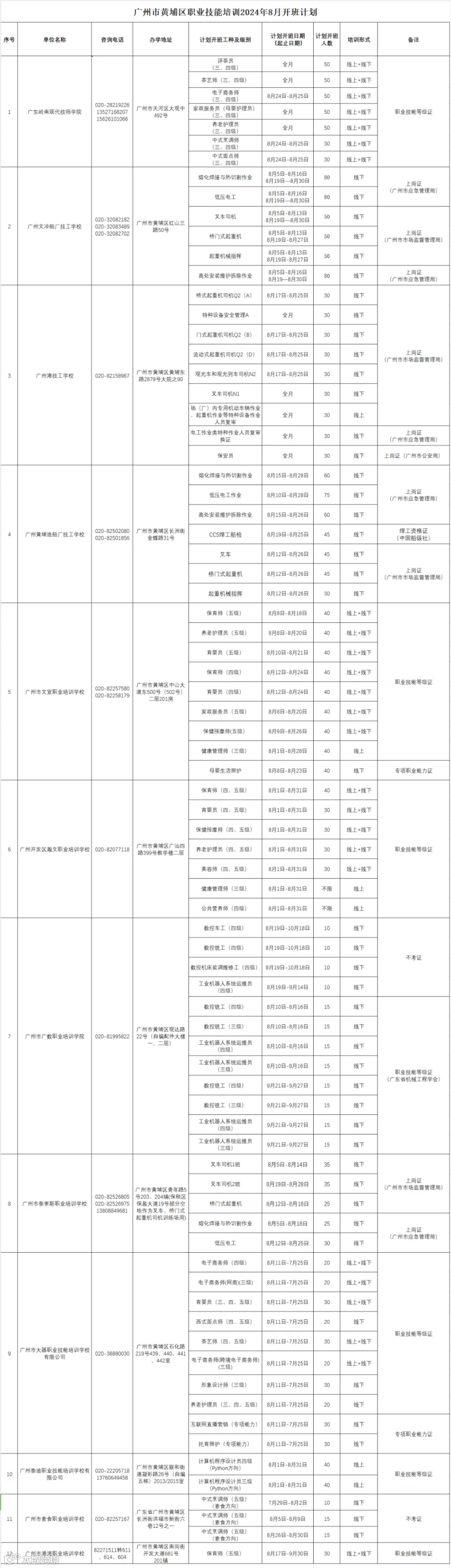 广州市黄埔区职业技能培训2024年8月开班计划通知