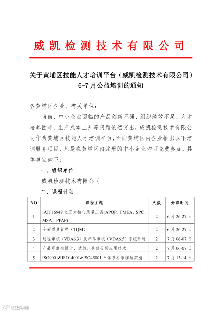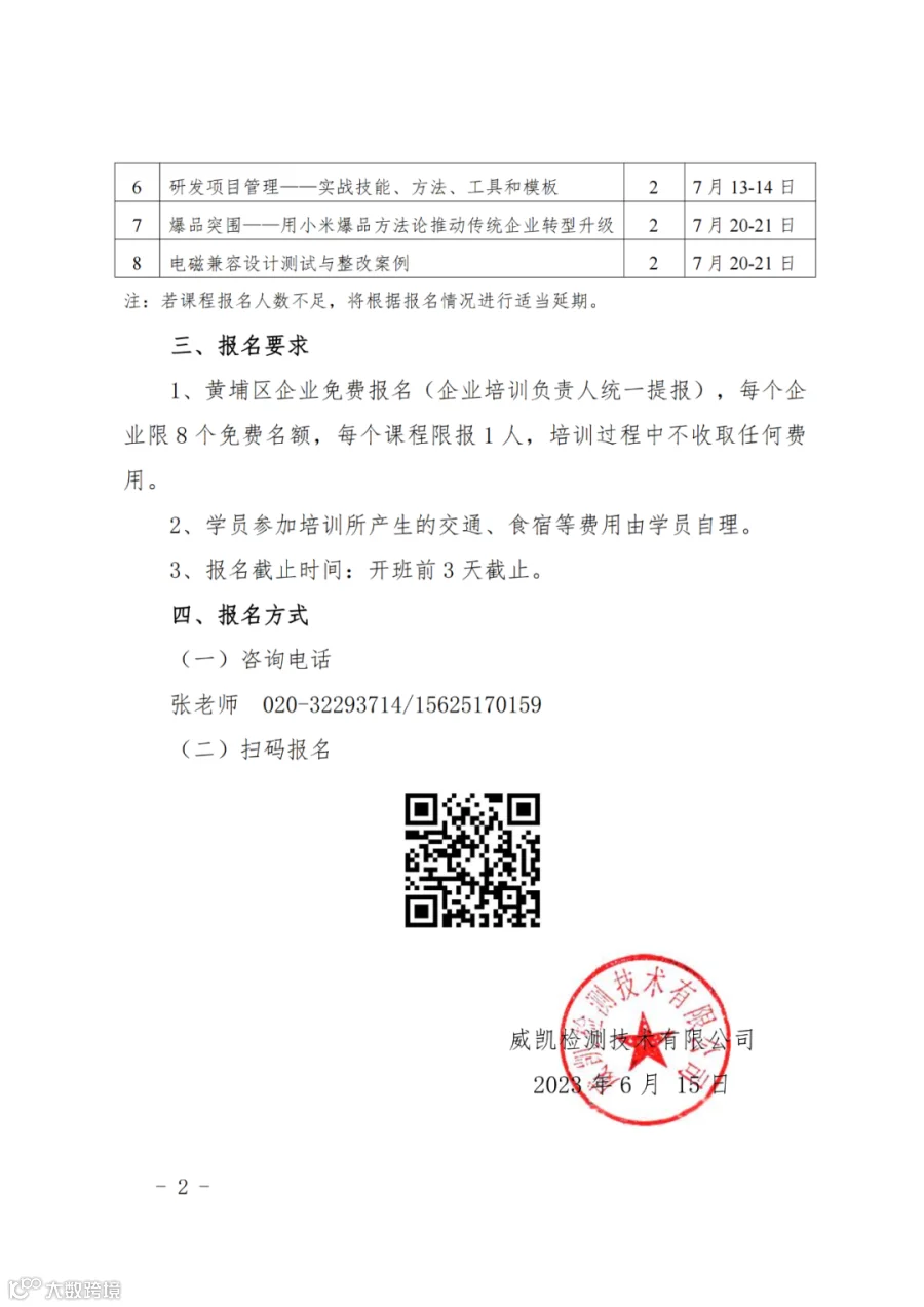 黄埔区技能人才培训平台——威凯检测技术有限公司将于2023年6月- 2023年7月组织召开一系列公益培训课程,帮助各中小企业更好应对发展中的突出问题,实现共同繁荣。课程详情请见通知,欢迎我区企业员工扫描以下通知二维码免费报名,名额有限,先到先得。