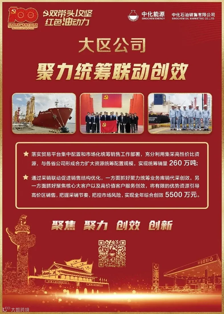 根据集团“攻坚克难 党旗飘扬”主题活动安排和中化能源“双带头攻坚”有关部署要求,大区公司以“聚力统筹 联动创效”攻坚项目承接石油销售公司 “红色油动力”品牌。截止目前,通过聚焦 聚力 创效 创新,大区公司“聚力统筹 联动创效”攻坚项目超时间进度完成统筹和外销业务目标,取得阶段性成果。