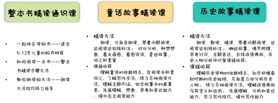 教师以多年培训实战经验、儿童阅读与教育行业经验、亲子阅读实践经验,针对不同年龄阶段儿童开设精读通识课、童话故事精读课、历史故事精读课,在提升孩子知识贮备的同时,更加有效、精准地增强孩子语言能力、写作能力、想象能力和独立思考能力。