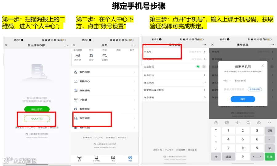2.首次使用时,需点击“个人中心”-“账号设置”-“手机号”绑定报名手机号;